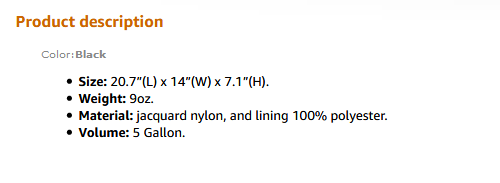 HIGH CAPACITY: 5 Gallon. Interior a zipper pocket and a mesh water bottle pocket.